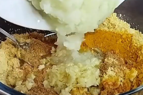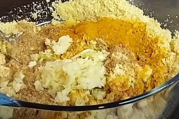حالا نوبت ادویه‌هاست، برای طعم‌دهی بهتر مقداری نمک، فلفل سیاه، زردچوبه و کمی دارچین اضافه کنید. برخی افراد برای عطر بیشتر، از پودر تخم گشنیز یا ادویه‌های محلی هم استفاده می‌کنند. تمام مواد را خوب ورز دهید تا یک مایه منسجم و یکدست حاصل شود.