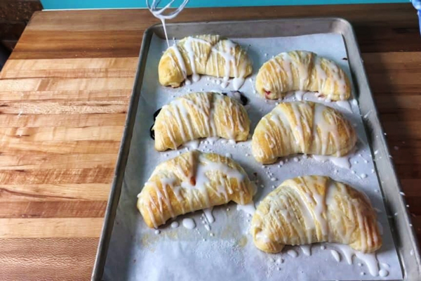 فر را با دمای ۱۶۰ درجه سانتیگراد گرم کنید. حال سینی را به مدت ۲۰ تا ۳۰ دقیقه در فر قرار دهید تا کاملا پف کرده و کمی طلایی و پوسته پوسته شوند. در همین حین، لعاب ساده را درست کنید؛ با هم زدن پودر قند و آب، مخلوطی یکدست و شفاف تهیه کنید. در صورت عدم دسترسی به فر، طرز تهیه شیرینی دانمارکی در توستر را بخوانید.