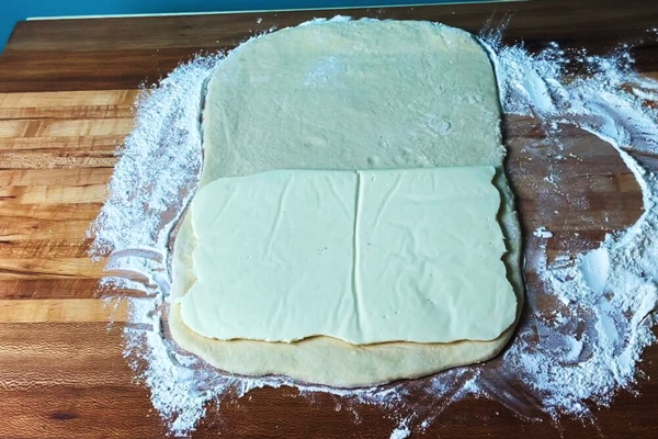در پنجمین مرحله از طرز تهیه شیرینی دانمارکی پنیری، خمیر را به شکل مستطیل ۳۰×۴۵ سانتیمتر پهن کنید. کره سفت را از فریزر خارج کرده و کاغذ روغنی آن را جدا کنید. کره را روی نیمی از خمیر قرار دهید. برای این که لبهها هنگام تا زدن به هم بچسبند، با برس شیرینیپزی کمی آب روی لبهها بزنید. نیمه خالی خمیر را روی کره تا کنید تا کره بین دو لایه خمیر محصور شود.