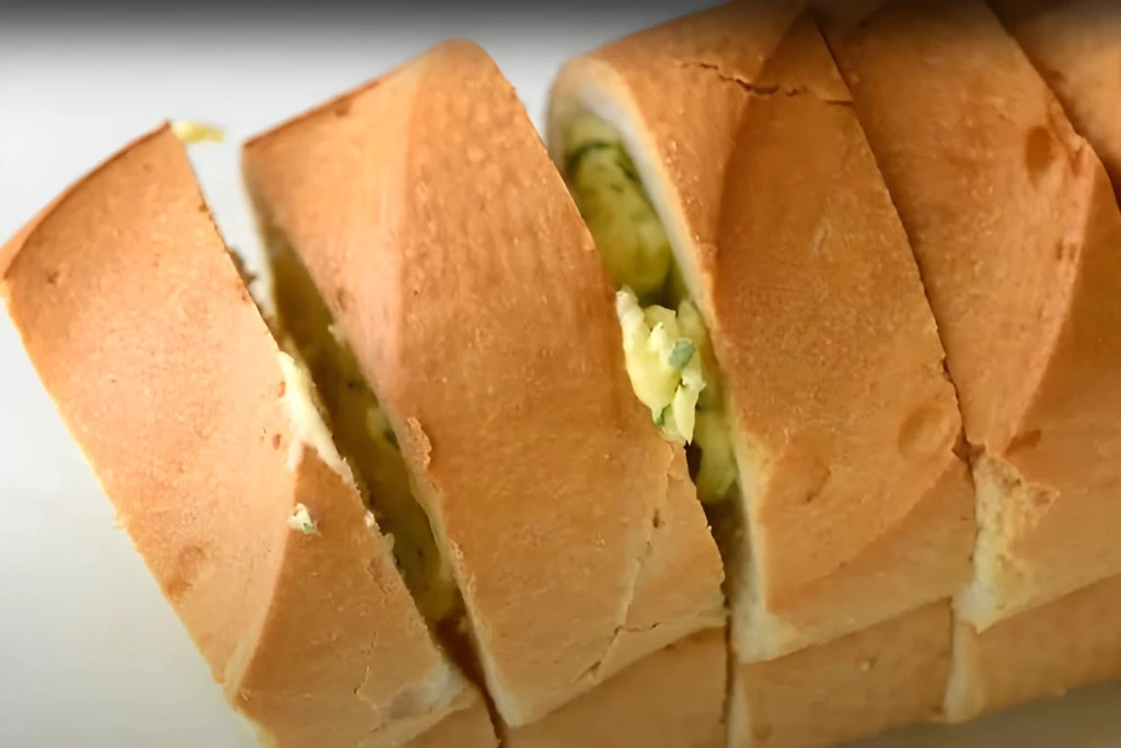 در ابتدا فر را روی ۲۰۰ درجه سانتیگراد گرم کنید. سپس نان باگت را ابتدا از وسط نصف کنید؛ بعد هر قسمت را به برشهایی با ضخامت حدود ۲ سانتیمتر ببرید، طوری که برشها کاملا جدا نشوند و نان به صورت یک تکه باقی بماند.