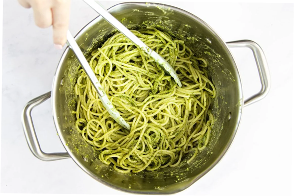 پاستای آبکششده را دوباره داخل قابلمه برگردانید و سس پستو را به آن اضافه کنید. حدود نصف پیمانه از آب پاستای کنار گذاشتهشده را هم داخل قابلمه بریزید و مواد را بهآرامی مخلوط کنید تا سس کاملا به خورد پاستا برود. در صورت نیاز، میتوانید مقدار بیشتری از آب پاستا اضافه کنید تا بافت سس به غلظت دلخواه برسد.
