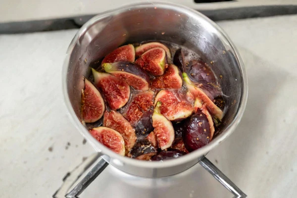 وقتی مخلوط شروع به جوشیدن کرد، حرارت را کم کنید و اجازه دهید حدود ۱۰ دقیقه روی حرارت ملایم بجوشد. هر از گاهی آن را هم بزنید تا انجیرها نرم شوند و ترکیب کمی غلیظتر شود.