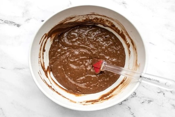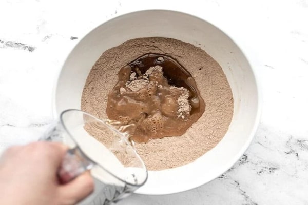 در سومین مرحله از طرز تهیه کیک خیس بدون شیر نوبت به اضافه کردن مواد تر می‌رسد پس باید یک حفره در کاسه ایجاد کنید. آب جوش، روغن، وانیل و سرکه را به مواد خشک اضافه کنید. حال به آرامی از مواد مایع در مرکز کاسه شروع به مخلوط کردن‌ کنید. با کمک کفگیر یا لیسک مواد را آن‌قدر هم بزنید تا آرد کامل با مواد مخلوط شود. تنها مراقب باشید که بیش از حد مایه کیک را هم نزنید. حال که علاقه به کیک و شکلات دارید پس طرز تهیه کاپ کیک شکلاتی خیس را حتما امتحان کنید.