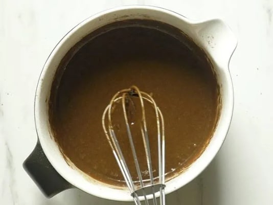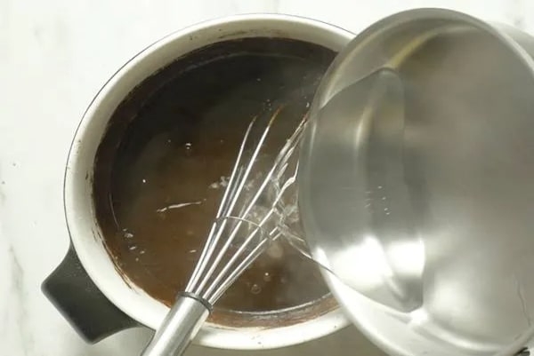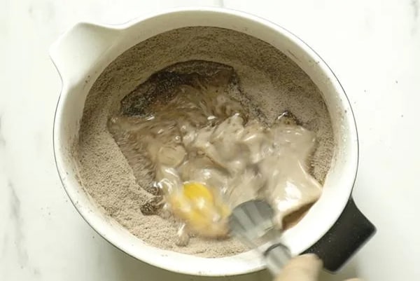 در سومین مرحله از طرز تهیه کیک شکلاتی ساده و فوری باید با کمک قاشق در مرکز کاسه یک حفره درست کنید. حال تخم مرغ، روغن، وانیل و شیر را داخل کاسه بریزید. مواد خشک و تر را برای شش دقیقه با همزن خوب با یکدیگر مخلوطشان کنید تا دیگر توده یا حبابی در کاسه باقی نماند. در ادامه تهیه کیک شکلاتی ساده آبجوش را هم اضافه کنید. مواد را آنقدر هم بزنید که آب جذب مایه کیکتان شود. در این مرحله باید بدانید که خمیر کیک شکلاتی صاف و روان است.