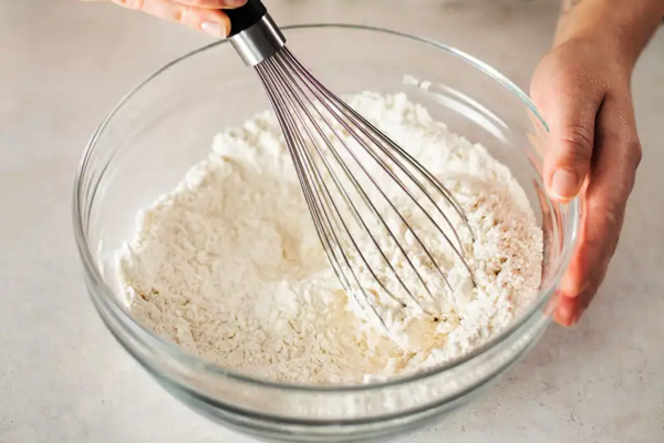 در اولین مرحله از تزیین پنکیک برای مدرسه، قبل از هر کاری باید آن را درست کنید. پس برای درست کردن خمیر پنکیک خانگی ابتدا در یک کاسه بزرگ، آرد، شکر، بیکینگ پودر و کمی نمک را با هم مخلوط کنید.