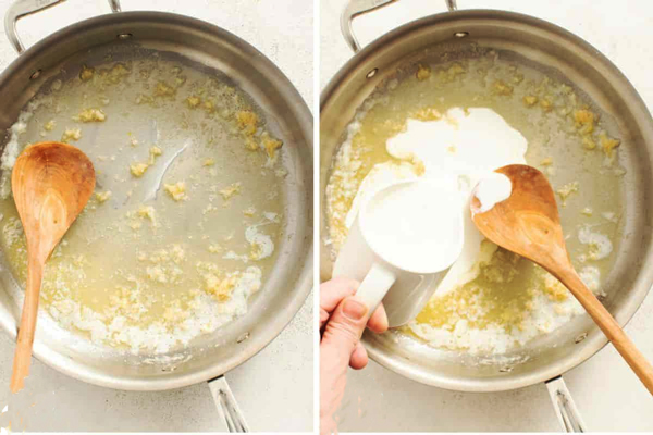 در ادامه طرز تهیه پاستا آلفردو بدون پنیر پارمسان، در یک تابه بزرگ، کره را روی حرارت متوسط ذوب کنید. سیر را خرد و به کره اضافه کنید. حدود یک دقیقه تفت دهید تا عطر آن آزاد شود. خامه غلیظ را به تابه افزوده و حرارت را کم کنید. مرتب مواد داخل تابه را هم بزنید تا سس غلیظ و یکدست شود. دقت داشته باشید که هنگام هم زدن، بعد از پنج دقیقه، خطی در سطح تابه باقی بماند. از طرز تهیه پاستا آلفردو با مرغ و قارچ غافل نشوید.