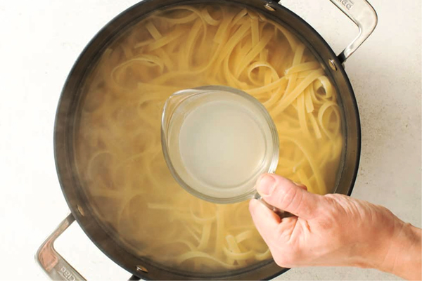 در اولین مرحله از طرز تهیه پاستا آلفردو بدون پنیر پارمسان، یک قابلمه بزرگ را پر از آب و کمی نمک کنید و روی حرارت بالا به جوش بیاورید. پاستا را مطابق دستور روی بستهبندی بپزید تا آل دنته شود. حال پاستا را آبکش کرده و حدود یک پیمانه از آب پاستا را برای تنظیم غلظت سستان نگه دارید. اگر از علاقهمندان به پنیر پارمسان هستید، طرز تهیه پاستا با پنیر پارمسان مناسب شما است.
