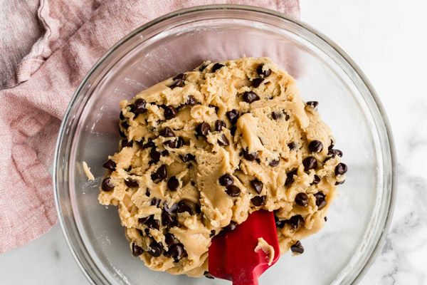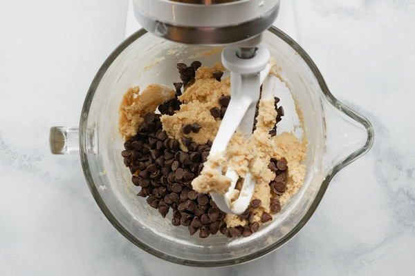 سپس در آخرین مرحله شکلات چیپسی را به خمیر اضافه و مانند آرد با سرعت و زمان کم مواد را مخلوط کنید. ممکن است به دلیل کره ذوبشده شکلاتهای چیپسی به خمیر کوکی نچسبند که تنها لازم است به همزدن ادامه دهید.