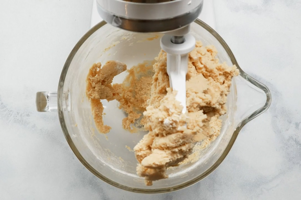 در کاسهای متوسط، کره بدون نمک، شکر قهوهای و شکر سفید را با همزن برقی هم بزنید. دقت کنید تا زمانی که هیچ دانه شکری باقی نماند و همچنین مخلوط مواد حالت کاملا کرمی به خود بگیرد، به هم زدن ادامه دهید. حتما از کره در حالتی استفاده کنید که از قبل در دمای اتاق قرار گرفته و کاملا نرم باشد. اگر به ترکیب طعم قهوه و شکلات علاقه دارید، میتوانید طرز تهیه کوکی قهوه و شکلات را بخوانید.
