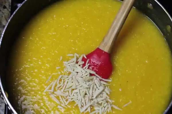 در سومین مرحله از طرز تهیه شله زرد مجلسی نوبت به خلال بادام میرسد. پس آن را خوب بشویید و در یک کاسه به همراه گلاب گفته شده خیسشان کنید. حال آنها را به همراه گلاب داخل قابلمه بریزید. شله زرد را خوب هم بزنید تا خلال بادامها کامل پخش شوند.