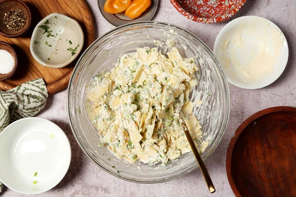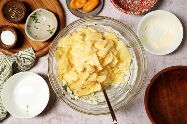 با استفاده از رنده مخصوص پنیر، پنیر گودای را به صورت نوارهای نازک و نامنظم در اندازههای مختلف برش بزنید. سپس آن را داخل همان کاسهای بریزید که مایونز و پنیر خامهای را در آن ترکیب کردهاید. در ادامه، پیازچههای خرد شده، مقداری از فلفل قرمز تند، گشنیز خرد شده و مقداری نمک و فلفل سیاه را هم به کاسه اضافه کنید.