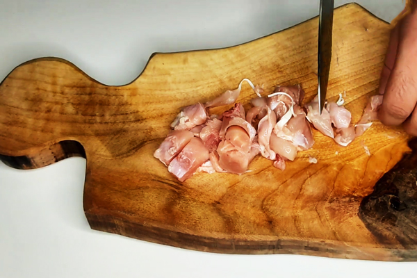 در طول مدتی که لپهها در حال پختن هستند، باید مرغ را آماده کنید. شما برای درست کردن این غذا میتوانید از بخشهای مختلف مرغ مثل سینه یا ران استفاده کنید. فقط باید استخوان بخش مورد نظر را بگیرید، به تکههای کوچکتر خرد و سرخشان کنید.