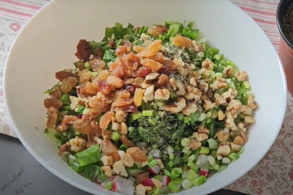 آخرین مرحله از طرز تهیه آب دوغ خیار مجلسی این است که مواد دیگر را اضافه کنید و هم بزنید و در نهایت با برگه نعناع، تربچه، کشمش، گردو، چند قطعه یخ و گل محمدی خشک آن را تزیین کنید.