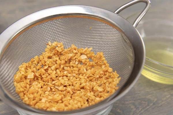 در پنجمین مرحله از طرز تهیه آش گندم یزد باید باقی مانده پیازها را خلالی خرد کنید. سپس آنها را در روغن داغ فراوان خوب سرخ کنید تا کاراملی شود. بعد سیر را خوب پوست کنده و ریز خرد کنید. آنها را با کمی زردچوبه تفت دهید. در نهایت نعناع خشک را در روغن داغ بریزید. آن را برای دقایق کوتاه تفت دهید. مراقب باشید که نعناع داغتان نسوزد چراکه طعم تلخی به خود خواهد گرفت. اگر فوتوفنهای سرخ کردن پیاز را نمیدانید طرز تهیه پیاز کاراملی به سبک آشپزها را بخوانید.