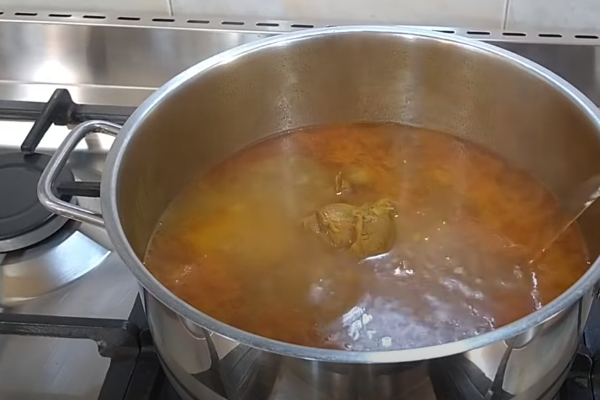 بعد از تفت دادن ماهیچهها و سبزیجات، آب را به قابلمه اضافه کنید و بگذارید مواد در آب جوش بیافتد. پس از اینکه آب جوش آمد، میتوانید رب گوجهفرنگی را در کمی روغن تفت داده و به سوپ اضافه کنید.