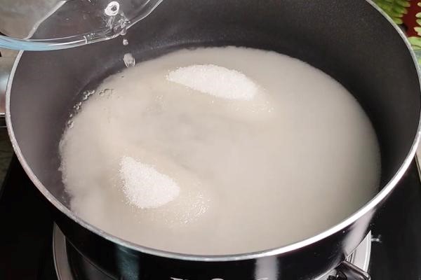 بعد از جوش آمدن آب، آرد را بههمراه نشاسته، یکبار الک کنید، سپس به آب و شکر در جال جوشیدن، اضافه کنید. بهمحض اضافه کردن آرد و نشاسته، سریع با یک لیسک یا قاشق، شروع به هم زدن کنید تا در آب گلوله گلوله نشوند. هم زدن را تا جایی ادامه دهید که خمیر به دست آید.