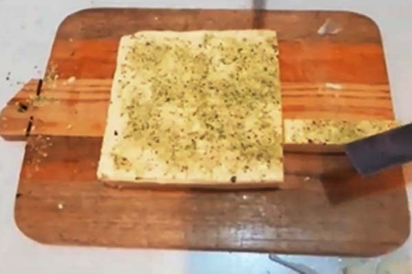 در چهارمین مرحله از طرز تهیه بستنی خشک، یک قالب ۱۵ در ۲۰ سانتیمتری را که کاغذ روغنی داخلش پهن یا کمی چرب کردهاید را بردارید و سپس مخلوط را به آرامی داخل قالب بریزید. مخلوط را کامل صاف کنید. در ادامه روی مخلوط را سلفون بکشید. حال قالب را برای پنج ساعت داخل فریزر بگذارید تا کامل سفت و خشک شود. در نهایت با گذشت پنج ساعت، قالب را بیرون بیاورید. در ظرف را باز بگذارید تا رطوبت آن خارج شود. مجدد برای پنج ساعت دیگر قالب را داخل یخچال بگذارید. (با این روش بستنی مشابه با فریز درایر خواهد داد.) در نهایت قالب را از فریزر خارج کرده و سلفون و کاغذ روغنی را جدا کنید. با یک چاقوی تیز بستنی را برش دهید. فراموشتان نشود که قبل از سرو آن را با پودر بادام و پسته تزیین کنید. اگر وگان هستید برای شما پیشنهاد جذابتری داریم؛ طرز تهیه بستنی وگان قهوه با شیر بادام را بخوانید.