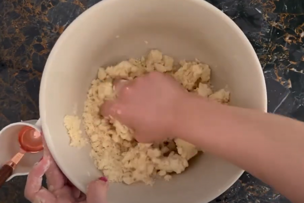 در یک کاسه بزرگ، آرد، شکر پودر شده و نمک را با هم ترکیب کنید. کره سرد را به صورت قطعه‌های کوچک اضافه کرده و با نوک انگشتان به خورد آرد بدهید تا مخلوطی شبیه شن مرطوب حاصل شود. تخم‌مرغ را اضافه کنید و کم‌کم آب یخ را افزوده، تا جایی که خمیر جمع شود. خمیر را در پلاستیک بپیچید و به مدت یک ساعت در یخچال استراحت دهید.