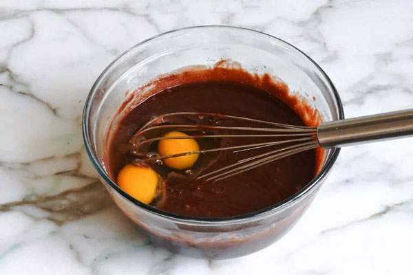 در ادامه شکر و نمک را به ترکیب اضافه کرده و دوباره مخلوط کنید تا طعمها کاملا ترکیب شوند. در نهایت تخممرغها و وانیل را به پایه شکلاتی اضافه کرده و با حرکات ملایم هم بزنید تا بافت فیلینگ صاف و یکدست باقی بماند. از دستور طرز تهیه گاناش با خامه صبحانه میتوانید مراحل آمادهسازی یک گاناش حرفهای را یاد بگیرید.