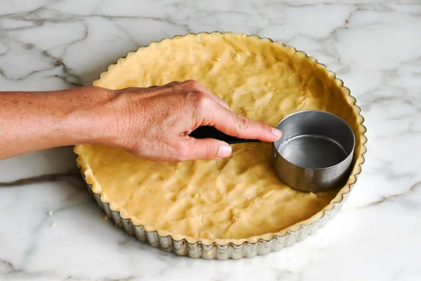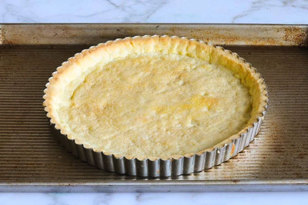 برای حفظ شکل خمیر، قالب را به مدت ۳۰ دقیقه در فریزر قرار دهید. سپس فر را روی ۱۷۵ درجه سانتیگراد گرم کنید و خمیر را حدود ۲۰ دقیقه بپزید تا خشک و کمی طلایی شود. پس از پخت، قالب را روی توری خنککننده قرار دهید تا کراست کاملا سرد شود.