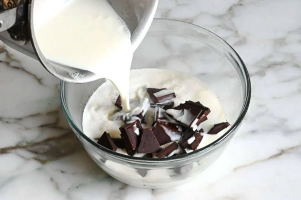 برای شروع مرحله آمادهسازی فیلینگ، ابتدا شکلاتهای خرد شده را در یک کاسه مناسب بریزید. خامه پرچرب را روی حرارت گرم کنید تا روی آن حبابهای بسیار ریز ایجاد شود، سپس خامه را به شکلاتها اضافه کنید و چند دقیقه صبر کنید تا شکلات نرم شود. با لیسک یا همزن دستی مخلوط را به آرامی هم بزنید تا یکدست و صاف شود.