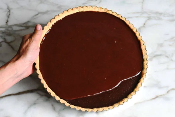 در مرحله چهارم از طرز تهیه تارت شکلاتی، گاناش شکلاتی آماده را به آرامی روی پوسته خنک شده بریزید و با لیسک سطح آن را صاف کنید تا یکنواخت شود. قالب را دوباره در فر قرار دهید و حدود ۲۰ تا ۲۵ دقیقه بپزید، تا مرکز فیلینگ تنها، کمی لرزان باقی بماند.