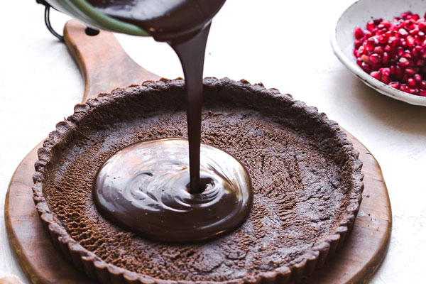 در این مرحله از طرز تهیه تارت یلدایی انار شکلاتی، نوبت ریختن فیلینگ روی خمیر تارت است. گاناش شکلاتی که کمی خنک شده را بهآرامی روی کراست سرد بریزید و با پشت قاشق یا لیسک سطح آن را صاف و یکنواخت کنید تا تمام کف و دیوارهها پوشیده شود.
