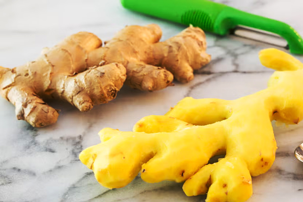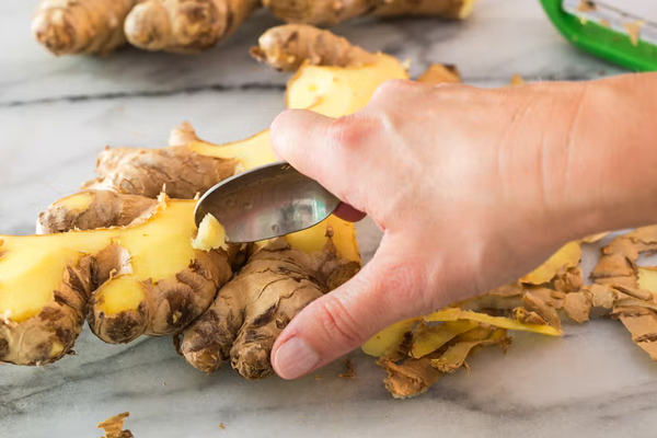 برای جدا کردن پوست زنجبیل به ویژه در نواحی منحنی و باریک، استفاده از پشت قاشق غذاخوری (قسمت گرد و کند آن) روشی ساده و موثر است که از هدر رفتن بخش خوراکی ریشه جلوگیری میکند. در نظر بگیرید که در صورت استفاده از زنجبیل تازه با پوست صاف و نازک، به راحتی و بدون دردسر میتوان پوست آنها را گرفت.