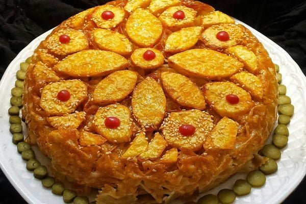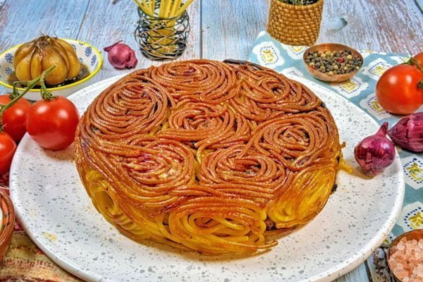 ۵. ته دیگ ماکارونی با ورقههای زیتون
