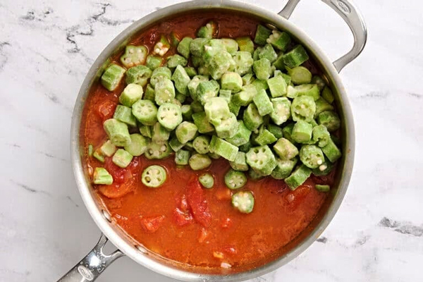اضافه کردن گوجه فرنگی خرد شده، سس و طعم‌دهنده به خورشت بامیه با گوجه