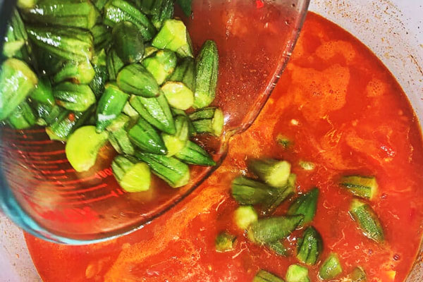 مرحله چهارم: افزودن بامیه و گوجهفرنگی