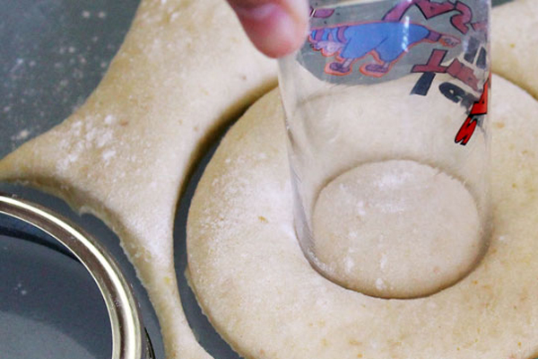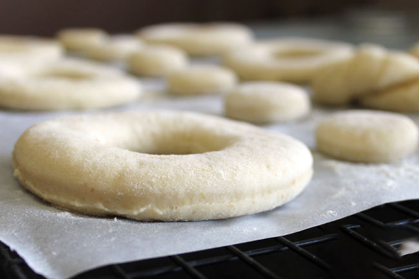 روی سطحی تمیز و خشک مقداری آرد بریزید و خمیر دونات را با ضخامتی مانند تصویر بالا باز کنید. خمیر را با کاتر دونات برش بزنید یا از یک لیوان شیشهای برای برش حلقه داخلی و از یک در شیشهای برای برش حلقه بیرونی دونات استفاده کنید. روی سینی فر کاغذ روغنی بکشید و روی سطح آن آرد بریزید و دوناتها را روی آن قرار دهید؛ سپس روی دوناتها یک ورقه پلاستیکی قرار دهید و به مدت ۴۵ دقیقه به دوناتهای نپخته استراحت دهید تا حجمشان دو برابر شود.