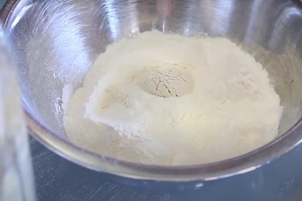 در اولین مرحله، مخمر را با نصف فنجان (۱۲۰ میلیلیتر) آب گرم مخلوط کنید و حدودا پنج دقیقه صبر کنید تا فعال شود. در همین حال، آرد همهمنظوره و آرد گلوتن خالص را الک کنید و در ظرف بزرگی قرار دهید.