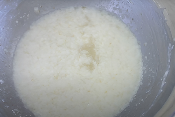 در کاسهای بزرگ شکر، کنجاله تخم کتان، روغن نارگیل و وانیل (اختیاری) را بریزید و مخمر را اضافه کنید؛ با گذشت زمان، مخلوط مخمر باید کفآلود شده باشد؛ سپس با همزن دستی مواد را به خوبی مخلوط کنید تا ترکیب مواد کاملا یکدست شوند.