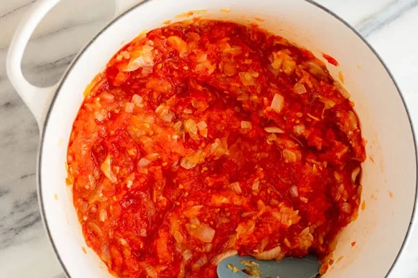 سیر را اضافه کنید، کمی هم بزنید و حدود ۳۰ ثانیه صبر کنید تا عطر سیر بلند شود. سپس گوجهفرنگیهای آمادهشده را اضافه کنید و با قاشق چوبی یا کفگیر سیلیکونی محکم، بخشهای قهوهایشده چسبیده به کف قابلمه را به آرامی از ته جدا کرده و داخل مخلوط گوجهفرنگی هم بزنید.