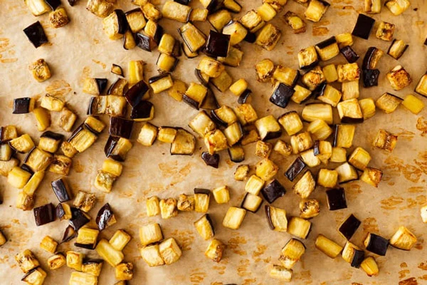 داخل یکی از سینیهای فر، بادمجانهای خردشده را با دو قاشق غذاخوری روغن زیتون مخلوط کنید تا کاملاً به روغن آغشته شوند. سپس آنها را در یک لایه یکنواخت روی سینی پخش کنید، یکچهارم قاشق چایخوری نمک روی آن بپاشید و سینی را کنار بگذارید.