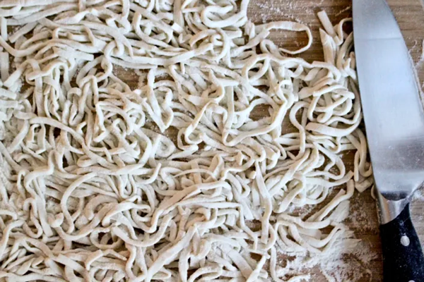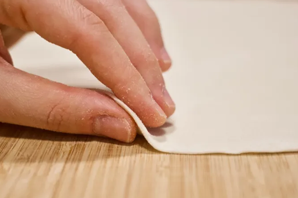 پس از استراحت، یکی از چانهها را روی سطح آردپاشیشده با وردنه تا جای ممکن نازک پهن کنید. سعی کنید تمام سطح خمیر ضخامت یکسانی داشته باشد. اگر دستگاه رشتهساز در اختیار دارید، خمیر را از آن عبور دهید تا به ضخامت دلخواه برسد و سپس آن را برش بزنید. در غیر این صورت، خمیر نازکشده را با دقت لوله کنید و با یک چاقوی تیز، به شکل نوارهای باریک و یک اندازه ببرید. سپس رشتهها را به آرامی از هم باز کنید.