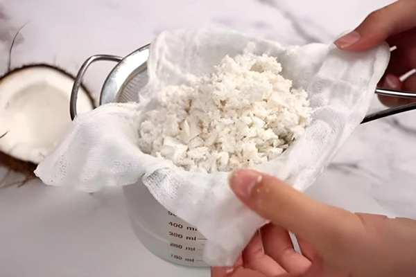 مخلوط نارگیل را از یک پارچه تنظیف یا صافی ریز روی یک کاسه صاف کنید تا شیر نارگیل داخل کاسه بریزد. با استفاده از کاردک، تفالهها را فشار دهید تا بیشترین مقدار مایع استخراج شود.