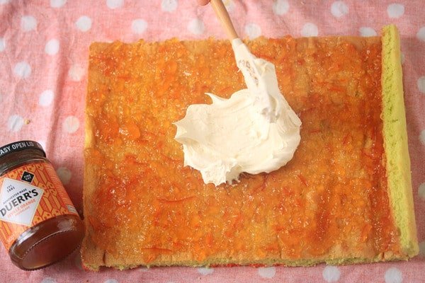 در ادامه نان رولت خنکشده را به آرامی باز کرده و با کمک لیسک روی آن مارمالاد بزنید. انتخاب طعم مارمالاد یا نوع مربا به ذائقه شما بستگی دارد.