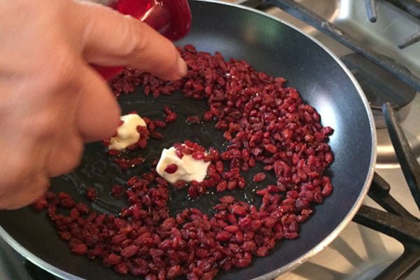 همزمان که زعفران دم میکشد، زرشک را خوب بشویید و اجازه دهید کمی در آب خنک خیس بخورد تا نرم شود بعد آن را از آب خارج کنید و خوب آب اضافهاش را بگیرد. بعد در یک ماهیتابه مناسب مقداری کره بریزید و بگذارید آب شود و بلافاصله زرشک را به همراه مقداری شکر تفت دهید. کمی که زرشکتان نرم شد قبل از آنکه زرشک و کره بسوزد آن را خاموش کنید. زرشک شما برای زرشک پلو آماده است. در آخر یک قاشق غذاخوری اضافه کنید. زعفران آب شده ررا هم به زرشک اضافه کنید تا آن را طعمدار کند. خوب است اگر دوست دارید مقداری خلال پسته هم به ترکیب زرشک اضافه کنید و در مرحله آخر کمی تفت دهید.