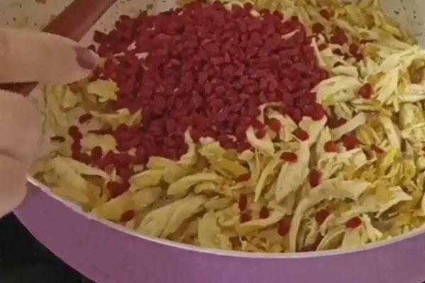 دومین مرحله از طرز تهیه زرشک پلو با مرغ ریش ریش این است که مرغ را که با یک پیاز، سیر و زردچوبه به مدت ۴۰ دقیقه بگذارید تا بپزد. بعد از این زمان مرغ را از قابلمه خارج کنید و سپس ریشریش کنید و در یک ماهیتابه که درونش روغن ریختید، سرخ کنید سپس رویش زعفران را بریزید و تفت دهید. بعد از این دو قاشق از زعفران دم شده را بریزید و خوب هم بزنید تا مرغ خوش عطر شود.