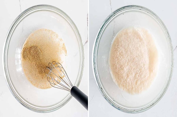 در اولین مرحله از طرز تهیه زولبیا خانگی آسان باید یک کاسه کوچک انتخاب کنید تا در آن آب ولرم و شکر را خوب مخلوط کنید. پودر خمیرمایه را روی مخلوط بپاشید و به آرامی هم بزنید. روی کاسه را برای ۱۰ دقیقه پوشانده و آن را کنار بگذارید. یک کاسه دیگر انتخاب کنید تا در آن نشاسته و ماست را مخلوط کنید. دقت داشته باشید که مخلوط ماست و نشاسته باید یکدست باشند. اگر مخلوط زولبیا سفت بود باید کمی ماست به آن اضافه کنید.