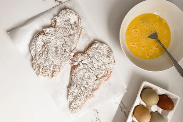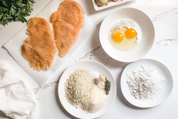 برای آماده کردن مواد سوخاری، در یک ظرف نصف پیمانه آرد معمولی را با نمک و فلفل سیاه مخلوط کنید؛ در یک ظرف دیگر تخممرغها را بشکنید و با نمک و فلفل سیاه هم بزنید؛ سپس در ظرف سوم، نصف پیمانه آرد سوخاری را با یکچهارم پیمانه پنیر پارمزان رندهشده ترکیب کنید و باز هم با نمک و فلفل سیاه مزهدار کنید.