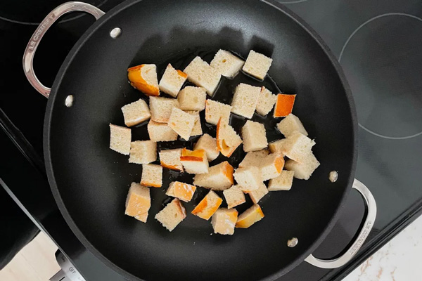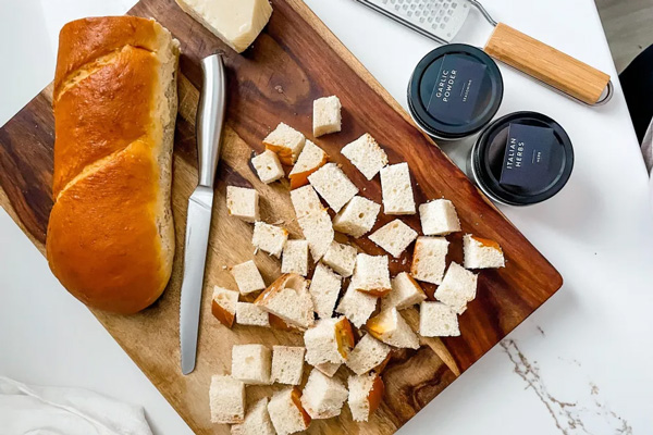 نان باگت را به صورت مکعبهایی ریز برش بدهید و در یک کاسه بزرگ بریزید؛ سپس دو قاشق غذخوری روغن زیتون، یک قاشق چایخوری پودر پیاز و پودر سیر و نصف قاشق چایخوری نمک را به نان اضافه و به خوبی مخلوط کنید تا تمامی قطعات نان به طور یکنواخت آغشته به چاشنیها شوند.