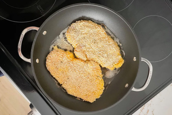 یک ماهیتابه بزرگ را روی حرارت متوسط قرار بدهید و دو قاشق غذاخوری کره کاله و مقداری روغن زیتون داخل آن بریزید؛ وقتی کره آب شد، مرغهای پوشش داده شده با پودر سوخاری را داخل ماهیتابه بگذارید و به مدت سه تا چهار دقیقه سرخ کنید تا طلایی رنگ شود؛ مرغها را برگردانید و دو تا سه دقیقه دیگر بپزید تا کاملاً مغزپخت شوند. در پایان مرغهای سرخ شده را روی یک بشقاب که با دستمال کاغذی پوشاندهاید منتقل کنید تا روغن اضافهشان گرفته شود.