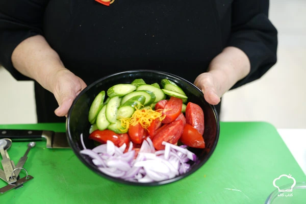 اول از همه، گوجهفرنگیها را قاچ کنید؛ سعی کنید برای این سالاد از بهترین گوجههای موجود در بازار استفاده کنید، چون یکی از اجزای اصلی سالاد گرجی هستند. گوجهها را داخل یک کاسه بزرگ بریزید. حالا خیارها را به اندازههای متوسط خرد کنید؛ لازم نیست خیارها را خیلی ریز خرد کنید. در این سالاد، معمولا همه مواد به شکل درشت استفاده میشوند.