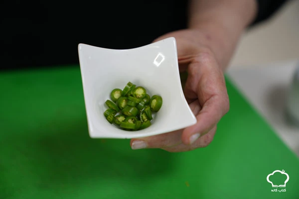 بعد، پیاز بنفش را خیلی نازک ورقهورقه کنید؛ پیاز را از بالا به پایین برش بزنید تا لایهها راحتتر از هم جدا شوند. برای این کار، ته پیاز را با یک برش «v» شکل جدا کنید؛ حالا پیاز را هم به کاسه گوجه و خیار اضافه کنید. در آخرین قدم از این مرحله، سبزی گشنیز و فلفل سبز را به صورت ریز خرد کنید.