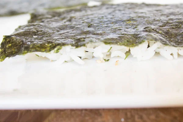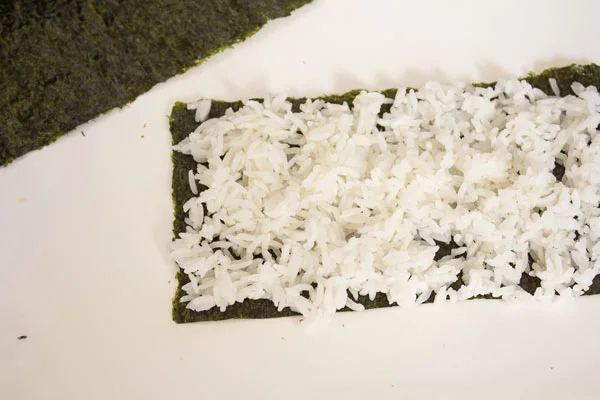 نیم ورق جلبک نوری را روی تخته برش بگذارید و مقداری برنج گرم (پختهشده) را روی قسمت چپ آن بریزید. برای اینکه برنج به دستتان نچسبد.