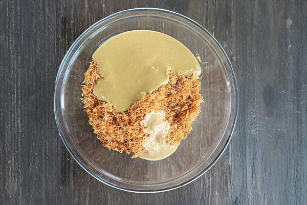 کنافه برشتهشده در مرحله قبل را در کاسهای بریزید و در ادامه کرم پسته و ارده را به آن اضافه و مواد فیلینگ را با هم مخلوط کنید تا به بافت یکسانی برسید.