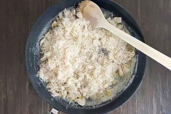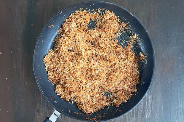 قبل از هر کاری، روی حرارت متوسط گاز یک تابه بزرگ را قرار دهید تا از پیش گرم شود. سپس رشتههای کنافه را به قطعات ریز خرد کنید، این کار باعث میشود کنافه بهطور یکنواختتر با شکلات ترکیب شود و طعم بهتری داشته باشد. در واقع وقتی رشتههای کنافه خرد و برشته میشوند، حالتی کرانچی و طلایی پیدا میکنند که در کنار نرمی و شیرینی شکلات، تضاد دلچسبی ایجاد میکند.